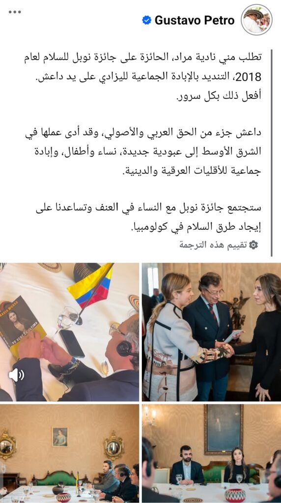 أعلنت سفيرة الأمم المتحدة للنوايا الحسنة والحائزة على جائزة نوبل للسلام، نادية مراد، أنها طلبت من رئيس كولومبيا، غوستافو بيترو، الاعتراف رسميًا بالإبادة الجماعية التي تعرّض لها الإيزديون على يد تنظيم داعش. جاء ذلك خلال لقائهما يوم الجمعة (21 تشرين الثاني 2025)، حيث ناقشا جهود دعم الناجيات من العنف الجنسي وسبل تعزيز التعاون عبر المؤسسات الدولية والأمم المتحدة.